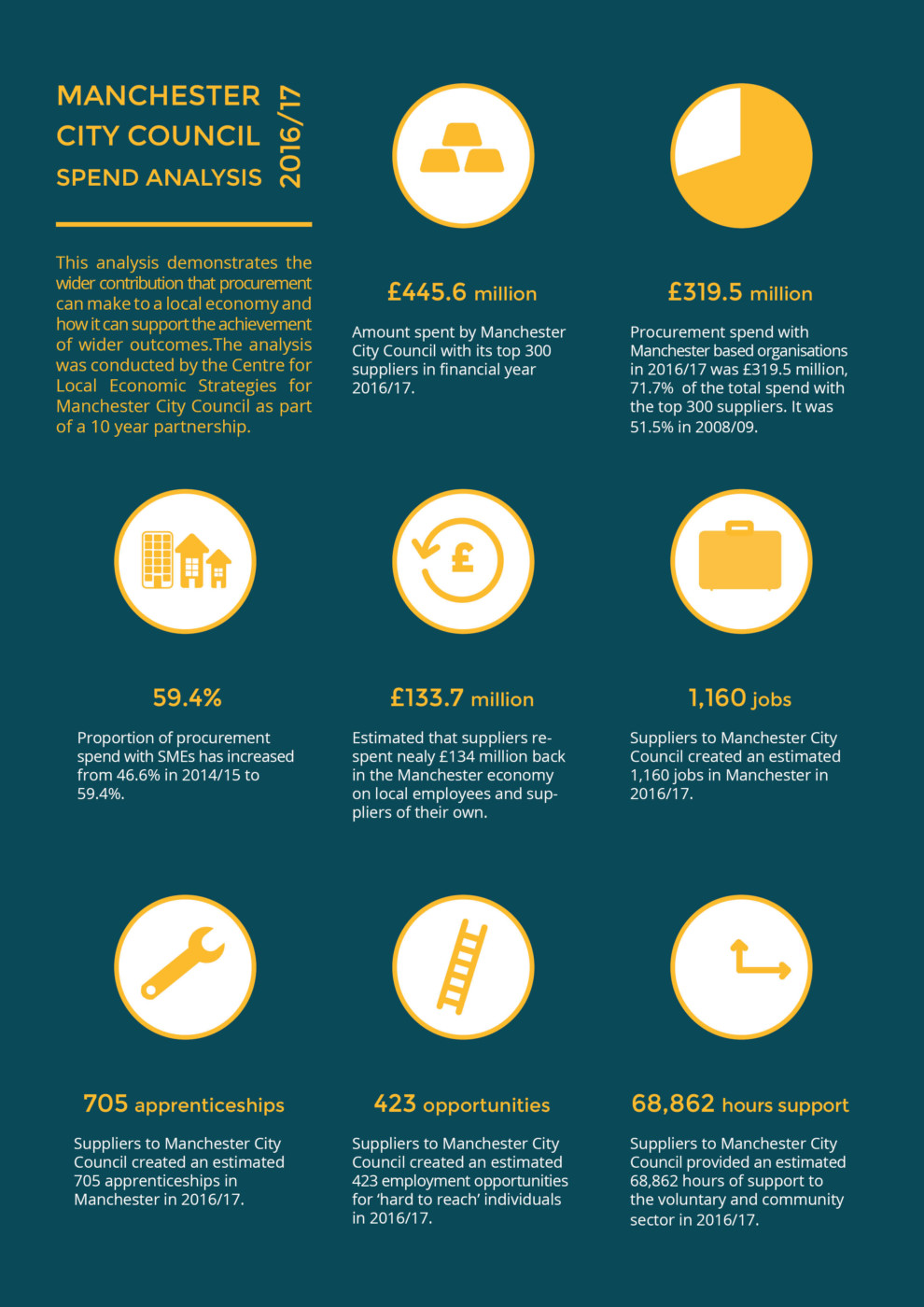 In addition to the direct benefits, the core findings from the 2016/17 analysis were that in the last year, the top 300 suppliers to Manchester City Council created: